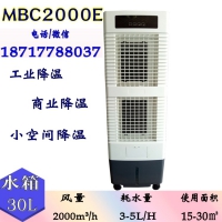 MBC2000E蒸发式冷风扇降温原理:利用水的蒸发过利用水的蒸发过程吸收空气的湿与热,使空气温度下降。即利用室外空气干球温度与湿球温度的差值达到降温制冷的目的。具体工作过程是:当室外的空气通过工业空调的核心部件——蒸发式热湿交换器“湿帘”时,从主机洒水管流出的水均匀地淋洒到“湿帘”上,流过“湿帘”的水便与室外空气完全接触,此时“湿帘”上的水开始吸热蒸发,而被吸入的空气沿着近似于等焓线发生绝热等焓降温过程变化。由于独特的“湿帘技术”,吸入的空气达到90%以上的降温效率。同时,由于“湿帘”的过滤性能,使空气中大多数的尘埃微粒被过滤掉。这样蒸发式冷风机就源源不断地送出清新自然的冷风,而将室内高温、带有异味和粉尘的空气排出室外,从而创造出一个清新自然的工作环境。